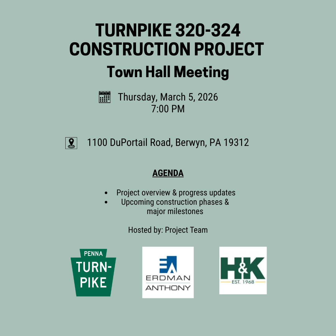 Join the Pennsylvania Turnpike Project Team as they hold a townhall meeting in Keene Hall on Thursday, March 5, 2026 at 7 PM to discuss the latest updates on the Turnpike 320-324 Construction Project. Items on the agenda include project overview, progress updates, upcoming construction phases & major milestones.